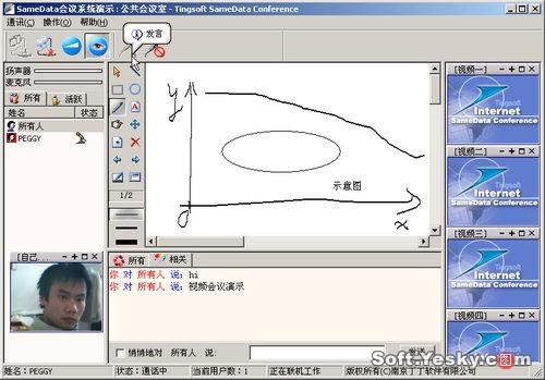 單擊會(huì)議列表后的“Enter”鏈接,即可啟動(dòng)Samedata客戶端進(jìn)入相應(yīng)的視頻會(huì)議系統(tǒng)。一個(gè)典型的Samedata視頻會(huì)議界面如圖21所示。