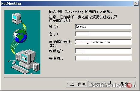 首次運(yùn)行Netmeeting,軟件會(huì)出現(xiàn)一個(gè)向?qū),要求?duì)用戶信息進(jìn)行簡(jiǎn)單的設(shè)定,單擊下一步,輸入個(gè)人信息,如圖4所示: