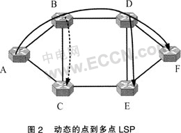 ....用圖2所示的6節(jié)點光網(wǎng)絡(luò)來闡述整個組播信令流程。與IP組播不同,點到多點LSP并不需要額外的組播組管理協(xié)議。這是因為葉子節(jié)點的地址直接被包括在請求中,而不像IP組播中僅僅只是使用一個D類地址。所有的組播樹請求都將用一個三元組來表示{T,a,L},其中T是組播樹的標識符,s是源節(jié)點,L是組播樹的葉子集合。當T等于O的時候意味著這是一個組播樹建立請求。例如,源節(jié)點A希望建立一個到葉子E和F的組播樹,那么這個請求就被表示為{0,A,{E,F(xiàn)}}。當這顆樹被建立后,它將被分配一個全局唯一的標識符,比如1。請求{1,A,{C1}}和{1,A,{F}}則分別意味著將葉子C嫁接到組播樹1和將葉子F從組播樹1中剪除。如果想刪除整棵樹,只需要將組播樹1的所有葉子都剪除即可,即{1,A,{C,E}}。