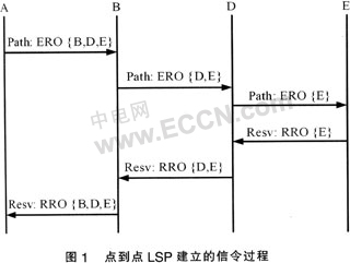 Switching Path)建立的信令過程。當入口標記交換路由器(LSR:Label Switching Router)A接收到一個業(yè)務(wù)請求后,它根據(jù)路由控制模塊計算出來的路由填寫顯示路由對象(ERO:Explicit