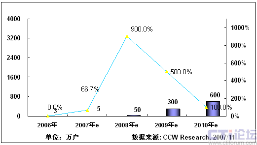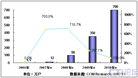 2008年,隨著3G在中國商用,以及奧運帶來豐富視頻內(nèi)容,將推動手機電視作為一項重要的移動增值業(yè)務(wù)將進入市場發(fā)展期;同時隨著網(wǎng)絡(luò)、終端、內(nèi)容、商業(yè)模式等因素的發(fā)展,產(chǎn)業(yè)鏈初步完善,看好手機電視業(yè)務(wù)的產(chǎn)業(yè)鏈各環(huán)節(jié)大力介入,北京奧運會將大大激發(fā)用戶使用手機電視業(yè)務(wù)的熱情,從而推動手機電視進入快速發(fā)展階段。根據(jù)計世資訊預(yù)計,2008年中國手機電視用戶將達(dá)到400萬。