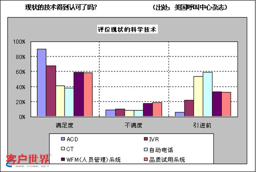這是調(diào)查美國(guó)客服中心的管理者們?nèi)绾卧u(píng)價(jià)自己公司引進(jìn)技術(shù)的統(tǒng)計(jì)表。雖然“滿意”并不意味著“相關(guān)技術(shù)被有效利用”?墒菑恼{(diào)查結(jié)果來(lái)看,他們對(duì)技術(shù)的滿意度相當(dāng)高,并且看起來(lái)都在有效利用相關(guān)技術(shù)。
