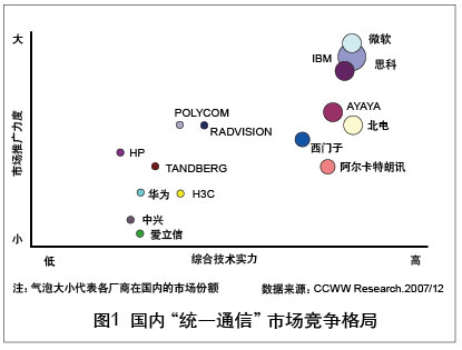 “統(tǒng)一通信”與傳統(tǒng)通信的根本區(qū)別在于不僅僅是網(wǎng)絡(luò)的融合,也是應(yīng)用的融合。從這個層面來看,“統(tǒng)一通信”真正帶給用戶的是成本的降低、工作效率的提升以及整個運行機制的改變。“統(tǒng)一通信”是以人性化為特征應(yīng)用層面的融合,這種融合囊括了更多的內(nèi)容、覆蓋更廣闊的領(lǐng)域、具有更大的力量,它使得通信產(chǎn)業(yè)與IT產(chǎn)業(yè),通信設(shè)備商、軟件廠商與電信運營商之間的邊界越來越模糊,跨行業(yè)、跨領(lǐng)域的聯(lián)盟與合作成為開拓市場的必需。但隨著眾廠商的紛紛加入,多款“統(tǒng)一通信”產(chǎn)品及解決方案的推出,“統(tǒng)一通信”市場展現(xiàn)出了勃勃生機和巨大的成長潛力。在這些廠商中,有市場調(diào)研數(shù)據(jù)顯示思科市場份額領(lǐng)先,市場占有率高達35%。各類廠商之間既有競爭又有合作,但還沒有一個廠商占絕對優(yōu)勢。實際上,“統(tǒng)一通信”市場上的競爭者并不僅僅是這幾家巨頭,眾多網(wǎng)絡(luò)工具廠商、商用電話廠商也參與了這一競爭平臺。幾乎所有和ICT有關(guān)的巨頭廠商都集中在了這個領(lǐng)域,“統(tǒng)一通信”正進入群雄爭霸的時代。國內(nèi)“統(tǒng)一通信”市場競爭格局如圖1所示。