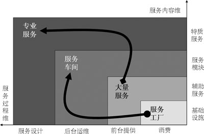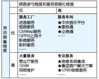 表1中以“★”標(biāo)識(shí)的服務(wù)基本上都是電信運(yùn)營(yíng)企業(yè)開(kāi)展移動(dòng)信息化后向客戶(hù)提供的服務(wù),可以明顯看出,更高的顧客參與度、更多的顧客化是這些服務(wù)的共同特點(diǎn),所以,移動(dòng)信息化運(yùn)營(yíng)的就是由服務(wù)工廠(chǎng)向服務(wù)車(chē)間轉(zhuǎn)型、由大量服務(wù)向?qū)I(yè)服務(wù)轉(zhuǎn)型。