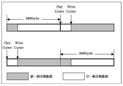 從理論上講,這已經(jīng)保證了音頻回放的流暢性。但在實(shí)現(xiàn)過程中,由于操作的對象是一幀的音頻數(shù)據(jù),其回放的時間僅是0.25秒,所以必須考慮的一個問題是程序的反應(yīng)速度問題。如果忽略由事件觸發(fā)到真正用Lock函數(shù)鎖定緩沖區(qū)的部分以進(jìn)行新數(shù)據(jù)寫入之間的時間,則這種實(shí)現(xiàn)方法沒有任何問題。除了最開始的兩幀數(shù)據(jù)外,新的一幀數(shù)據(jù)會緊跟在前一幀數(shù)據(jù)之后,彼此之間沒有重疊部分,也沒有空隙存在,能很好地達(dá)到音頻回放的流暢效果。但事實(shí)上,由事件觸發(fā)到真正用Lock函數(shù)鎖定緩沖區(qū)的部分以進(jìn)行新數(shù)據(jù)的寫入之間還必須經(jīng)過線程監(jiān)聽到事件,分析事件對應(yīng)的緩沖區(qū),然后再觸發(fā)相應(yīng)的回調(diào)函數(shù)來進(jìn)行