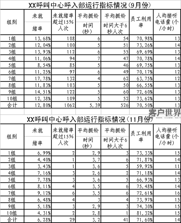 筆者所在呼叫中心從今年10月份開(kāi)始實(shí)行“四率管理”,以解決現(xiàn)場(chǎng)管理工作的存在的問(wèn)題,提高現(xiàn)場(chǎng)管理水平,提高服務(wù)效率。從統(tǒng)計(jì)數(shù)據(jù)看(見(jiàn)下表),實(shí)行“四率管理”后,呼叫中心的現(xiàn)場(chǎng)管理水平得到大幅提高,服務(wù)指標(biāo)增長(zhǎng)較快。在員工利用率基本保持不變的情況下,未就緒率、平均振鈴時(shí)間、每小時(shí)接聽(tīng)電話(huà)量等指標(biāo)均得到有效改善。其中,未就緒率從9月份的12.8%降低到6.3%,未就緒率低于15%的員工人次從1062次降低到29次;平均振鈴時(shí)間從5.4秒降低到3.2秒,平均振鈴時(shí)間大于6秒的人次從526人次降低到41人次。每小時(shí)人均接聽(tīng)電話(huà)數(shù)量從13個(gè)提高到14個(gè)。按8小時(shí)工作計(jì)算,每人每天接聽(tīng)電話(huà)數(shù)量增長(zhǎng)10個(gè)左右。具體統(tǒng)計(jì)數(shù)據(jù)見(jiàn)下表。