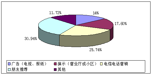 A、廣告(電視、報(bào)紙)(14%) B、演示(營業(yè)廳或小區(qū))(17.6%) C、電信電話營銷(25.74%) D、朋友推薦(30.94%)