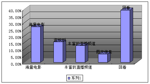 當(dāng)IPTV進(jìn)入家庭后,如何維系其可持續(xù)性,良性發(fā)展,便需要考慮用戶的使用心理,這個(gè)調(diào)查看出,內(nèi)容的豐富性和互動(dòng)的優(yōu)勢(shì)是IPTV最為用戶稱道的地方,因此,在數(shù)字電視目前還主要以頻道數(shù)量和單向?yàn)橹鞯那闆r下,如何加大這方面的優(yōu)勢(shì),將是IPTV的立身之本。