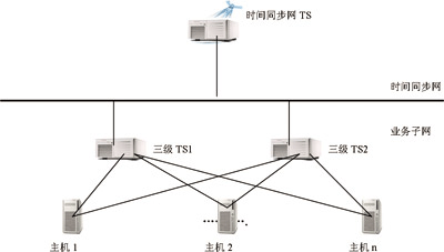 四川電信時(shí)間同步網(wǎng)對數(shù)據(jù)網(wǎng)元的授時(shí),統(tǒng)一采用設(shè)置三級時(shí)間服務(wù)器方式。該方式須在數(shù)據(jù)網(wǎng)元內(nèi)部選定一臺或兩臺機(jī)器作為三級TS,三級TS同步到時(shí)間同步網(wǎng)的時(shí)間服務(wù)器,系統(tǒng)內(nèi)的其他主機(jī)與三級TS保持同步,如圖2所示。