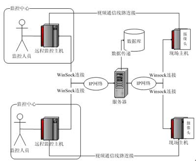 本系統基于瘦客戶端的C/S模式,在體系結構上采用以服務器為中心的星型結構,創(chuàng)新性地把監(jiān)控現場端和監(jiān)控中心端C角色化。即在本系統中所有的監(jiān)控現場端和監(jiān)控中心端相對整個系統的架構而言都是客戶端,它們的通信都需要經過服務器的驗證中轉。同時,監(jiān)控中心使用者的登錄由于這種架構模式,也必須要經過服務器的驗證才能成功登錄,進而獲得監(jiān)控的權利。