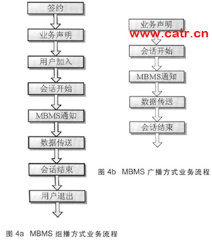 MBMS可應(yīng)用組播模式和廣播模式兩種業(yè)務(wù)模式。廣播模式接近于數(shù)字電視業(yè)務(wù),而組播模式專(zhuān)注和定位于群業(yè)務(wù)。組播模式提供了更好的計(jì)費(fèi)特性,包括服務(wù)訂閱、接入和推出功能,需要用戶簽約相應(yīng)組播組,進(jìn)行業(yè)務(wù)激活,并產(chǎn)生相應(yīng)的計(jì)費(fèi)信息,而廣播業(yè)務(wù)不需要小區(qū)中所有用戶都制定該業(yè)務(wù)便可以獲得。由于組播和廣播模式在業(yè)務(wù)需求上存在不同,導(dǎo)致其業(yè)務(wù)流程也不同(見(jiàn)圖4a、圖4b)。