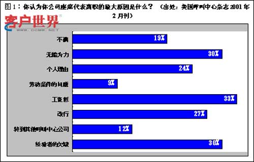 圖1是美國(guó)呼叫中心的調(diào)查結(jié)果。從顯示的結(jié)果來(lái)看,辭職的最大原因是工資低,其次是升職機(jī)會(huì)少。其中為了從事其他職業(yè)而辭職的占27%,要轉(zhuǎn)到別的客服中心工作的占12%?吹竭@個(gè)結(jié)果之后,發(fā)現(xiàn)即使在美國(guó),客服中心有關(guān)人員也沒(méi)有得到相應(yīng)的待遇。