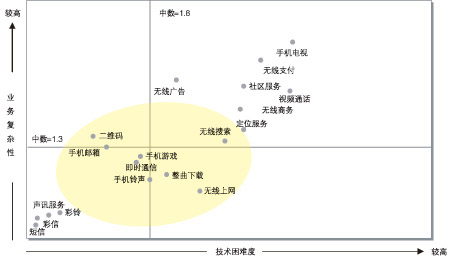 諾基亞西門子通信借鑒國(guó)外的無(wú)限增值業(yè)務(wù)經(jīng)驗(yàn)和對(duì)國(guó)內(nèi)運(yùn)營(yíng)商業(yè)務(wù)的分析提出“技術(shù)困難度—業(yè)務(wù)復(fù)雜性”模型來詮釋無(wú)線增值業(yè)務(wù)。