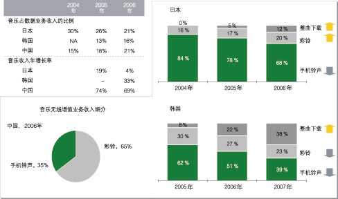圖3 無(wú)線音樂業(yè)務(wù)在日本、韓國(guó)和中國(guó)的發(fā)展情況