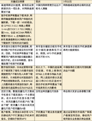 無(wú)線音樂市場(chǎng)的現(xiàn)狀、3年以后的情況以及成功的關(guān)鍵因素歸納總結(jié)見表2。