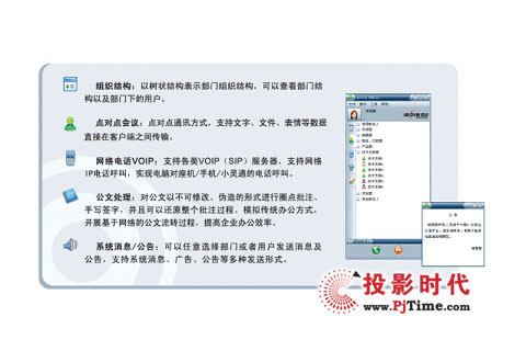 Center運(yùn)營(yíng)架構(gòu)為基礎(chǔ),有效整合了企業(yè)的如電話、傳真、手機(jī)、短信、E-mail、即時(shí)通訊等各種常用的通信設(shè)備和媒體應(yīng)用,并進(jìn)行統(tǒng)一管理、計(jì)劃及協(xié)同,是一套集即時(shí)通訊、網(wǎng)絡(luò)電話、點(diǎn)對(duì)點(diǎn)會(huì)議、多方視頻會(huì)議、遠(yuǎn)程教學(xué)、遠(yuǎn)程監(jiān)控、組織結(jié)構(gòu)等為一體的桌面融合辦公系統(tǒng),能夠全面滿足企業(yè)遠(yuǎn)程的日常交流、會(huì)議培訓(xùn)、協(xié)同辦公、商務(wù)談判、指揮調(diào)度、安全保衛(wèi)等各種需求。
