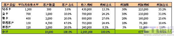 同時,如下表2所示,我們給定了不同客戶分群的客戶平均月消費水平及利潤貢獻比率。通過計算可以得出,高端的鉆石卡客戶雖然僅占客戶數(shù)的3%,貢獻了收入的15.5%,卻貢獻了三分之一的利潤。而占近半數(shù)的普通客戶,大約貢獻了收入的四分之一,僅僅貢獻了利潤了10%左右。在一些行業(yè)中,服務(wù)和交易成本所占比重較高,普通客戶群甚至有可能會帶來負(fù)利潤。