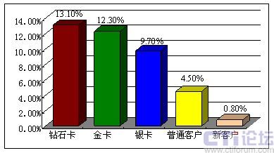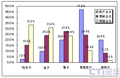 因為高端客戶在利潤貢獻中所起的巨大作用,通過簡單的計算即可得出,每一名鉆石卡客戶流失帶來的利潤損失,相當(dāng)于9.4名銀卡客戶流失帶來的損失,或相當(dāng)于50名普通客戶流失帶來的損失,或相當(dāng)于125名新用戶流失帶來的直接損失。