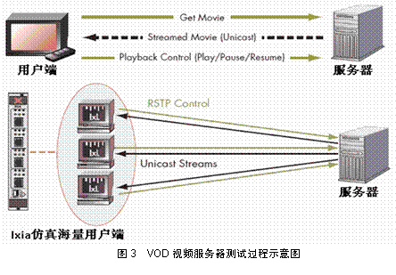 Media Server等業(yè)界常見的視頻服務(wù)器互通并提供性能測(cè)試。圖3是VOD服務(wù)器交換過程與IXIA進(jìn)行性能測(cè)試示意。