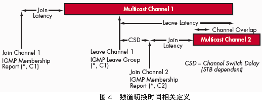 。6)頻道重疊時(shí)間:如果系統(tǒng)頻道切換采取接收到所請(qǐng)求頻道的組播包之后才停止原頻道的組播包的方式,則頻道重疊時(shí)間即指接收到所請(qǐng)求頻道的第一個(gè)組播包與接收到原頻道的最后一個(gè)組播包之間的時(shí)間間隔。
