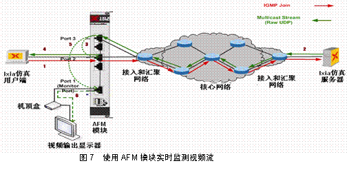 另外一種常見的應(yīng)用場(chǎng)景是對(duì)網(wǎng)絡(luò)中存在的IPTV組播流和單播流能夠進(jìn)行被動(dòng)實(shí)時(shí)監(jiān)測(cè)并能夠評(píng)估相應(yīng)視頻流的視頻質(zhì)量。IXIA獨(dú)特的視頻流提取模塊AFM支持該特性的測(cè)試(見圖6)。