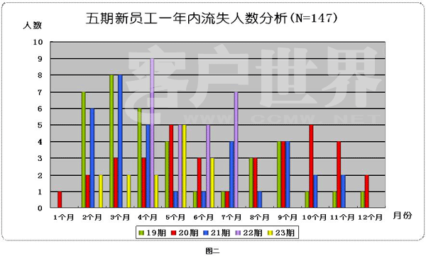 從數(shù)據(jù)觀察,在新員工入職的后6個(gè)月左右,出現(xiàn)一個(gè)20%左右的離職率,就總體離職情況分析,成為當(dāng)期員工離職的比例高峰區(qū)。也可以理解為,在新員工入職后6個(gè)月,對員工進(jìn)行有效的離職干預(yù),可以緩解總體流失情況發(fā)展。從員工入職培訓(xùn)開始,依據(jù)收集的資料,進(jìn)行培訓(xùn)內(nèi)容調(diào)整,從根本上緩解員工不良內(nèi)心體驗(yàn),成為干預(yù)流失率的重要條件之一;各中心新員工培訓(xùn)體系中,較少的涉及“澆涼水”的內(nèi)容。也就是可以準(zhǔn)確的、不夸張的描述工作負(fù)面情緒、事件、環(huán)境的內(nèi)容?偸前殡S培訓(xùn)師也許不認(rèn)可的,較為“美化的”遠(yuǎn)景描述,形成新員工脫離現(xiàn)實(shí)意義層面的理解與期望,此現(xiàn)象在較大程度上,造成員工早期離職的情況發(fā)生。隨著這些過高期望員工的流失,在入職后的第三個(gè)月,多數(shù)離職數(shù)據(jù)呈現(xiàn)增加的規(guī)律。此事呈現(xiàn)的心理層面的意義為:由于80后在責(zé)任、忍耐、堅(jiān)持等人格特征上的不良教育結(jié)果因素影響,出現(xiàn)以“逃避”為主策略的處理困難風(fēng)格傾向。想要緩解此問題,不能單獨(dú)的從任何一個(gè)角度出發(fā),因?yàn)閱T工的心理防御系統(tǒng)將此時(shí)的離職,多數(shù)責(zé)任外推,如:這不是人干的活!班次沒有人性化!等等行業(yè)特征因素,總是充滿理由的離開工作,當(dāng)然這樣的員工,永遠(yuǎn)也找不到他理想中的不單調(diào)的工作,在絕大多數(shù)離職員工中,我相信大多數(shù)不可能擁有滿意的工作。因?yàn)殡x職本質(zhì)是逃避責(zé)任。