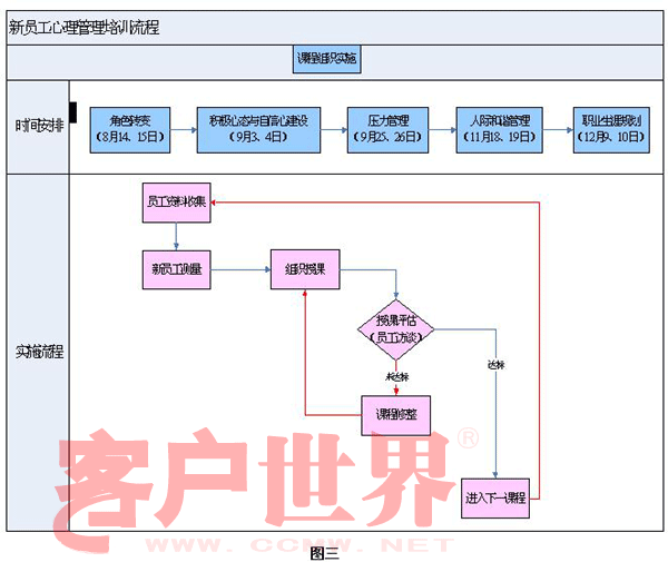 聽上去好像是沒有辦法來緩解這樣一個(gè)心理教育上的難題,這個(gè)難題的形成,具有80后教育倡導(dǎo)“愛”成分較多,沒有任何的“責(zé)任”教育的結(jié)果。員工需要進(jìn)行“再社會(huì)化”的教育補(bǔ)償。企業(yè)有義務(wù)對其員工進(jìn)行補(bǔ)償性教育。在適當(dāng)?shù)臅r(shí)候,根據(jù)員工的內(nèi)心體驗(yàn),適時(shí)的提供教育引導(dǎo),可以明顯的改善員工工作態(tài)度,再次適時(shí)成為關(guān)鍵因素。項(xiàng)目組從收集數(shù)據(jù)中達(dá)到啟示,制定了新員工培訓(xùn)節(jié)律計(jì)劃(圖3)希望可以通過實(shí)施的效果評估,帶來啟發(fā)。