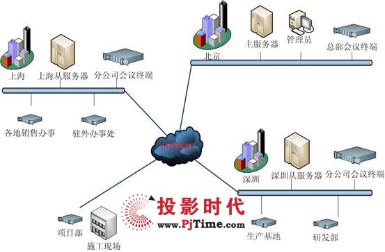 3臺(tái)高端專用服務(wù)器作為視頻會(huì)議服務(wù)器,可容納多點(diǎn)同時(shí)開(kāi)會(huì),以確保系統(tǒng)的穩(wěn)定性和性能要求。主服務(wù)器放置在總公司,從服務(wù)器共2個(gè),分別放置在輻射分公司面大,位于分公司中心的兩個(gè)城市。所有接入的服務(wù)器和客戶端采用同一網(wǎng)絡(luò)服務(wù)商的線路。配置了使用1000M服務(wù)器專用網(wǎng)卡,以保證正常的音視頻信號(hào)的傳輸。并且將服務(wù)器放置在主干/核心交換機(jī)上,使服務(wù)器和客戶端的路由/交換性能達(dá)到最佳效果。其網(wǎng)絡(luò)拓?fù)鋱D如下: