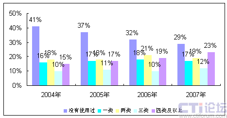 圖1 2004-2007年用戶使用智能手機(jī)使用的移動(dòng)互聯(lián)網(wǎng)種類