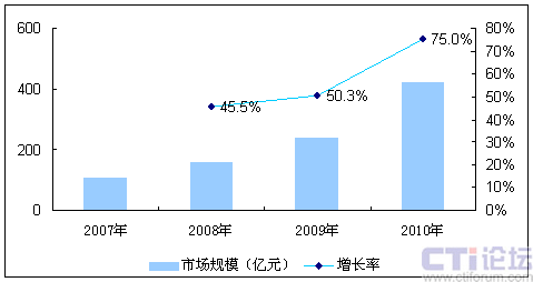 圖2 2008-2010年中國(guó)移動(dòng)互聯(lián)網(wǎng)市場(chǎng)規(guī)模預(yù)測(cè)
