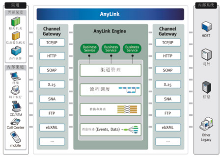 通過基于AnyLink的電子渠道統(tǒng)一接口平臺解決方案提供各類網(wǎng)關(guān)功能,可實(shí)現(xiàn)各種系統(tǒng)的整合,還提供報(bào)文轉(zhuǎn)換及路由的中介功能、管理和監(jiān)控所需的GUI工具,實(shí)現(xiàn)系統(tǒng)運(yùn)營和維護(hù)及開發(fā)的最佳化(如圖所示)。
