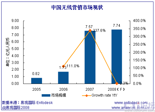 易觀國際(Analysys International)研究發(fā)現(xiàn),中國無線營銷市場經(jīng)過2007年的高速發(fā)展后,2008年已經(jīng)進入了商業(yè)模式探索階段,從市場規(guī)模上看,2008年全年無線營銷市場規(guī)模僅比上年增長2.3%。易觀國際(Analysys International)認為,無線營銷市場增速的明顯放緩主要由于短信廣告市場的萎縮,短信廣告是無線營銷市場最大的細分領域,2007年曾經(jīng)占整個無線營銷市場規(guī)模的72.7%。