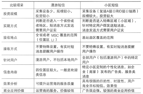 兩個系統(tǒng)最大的不同點是接收短信的范圍和用戶不一樣,漫游短信是針對漫游用戶在一個相對較大區(qū)域內(nèi),因此只適合運營商發(fā)一般性的問候短信,提高運營商的服務(wù)質(zhì)量;小區(qū)短信則是在一個較小的區(qū)域內(nèi)(特定地點),針對特定用戶(可能包括漫游用戶),在一個特定的時間,發(fā)送特定的消息,因此這種消息具有較強的針對性,具有較高的商業(yè)用戶價值,可用于企業(yè)(商家)發(fā)布廣告和服務(wù)類的信息,能夠成為一種典型的增值服務(wù)。