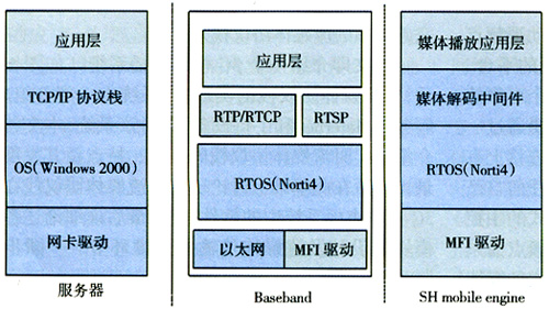 軟件平臺:SH-7300實(shí)時操作系統(tǒng)(Norti4),MPEG-4audio/videoencoder/decodermiddleware,流媒體協(xié)議棧(如圖2所示)。