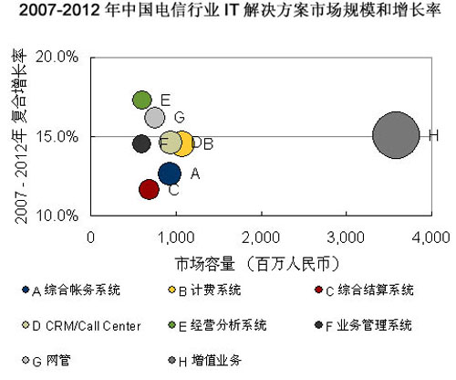 巨大的電信市場蛋糕給產(chǎn)業(yè)鏈的各級廠商都帶來良好的發(fā)展機遇,而其運營支撐系統(tǒng)市場無疑將是增長最快的一部分。據(jù)市場調(diào)查機構(gòu)IDC預(yù)計,2007年-2012年電信行業(yè)將注重運營支撐系統(tǒng)的全業(yè)務(wù)運營整合和支持前端業(yè)務(wù),因此3G增值業(yè)務(wù)、經(jīng)營分析系統(tǒng)、客戶關(guān)系管理系統(tǒng)、IT服務(wù)管理系統(tǒng)等建設(shè)將實現(xiàn)快速增長。運營商的已有項目仍然會持續(xù)升級維護,以及配合全業(yè)務(wù)運營作出功能上的提升。IDC預(yù)計,2012年電信行業(yè)IT解決方案整體市場規(guī)模將達(dá)到193.5億元人民幣。
