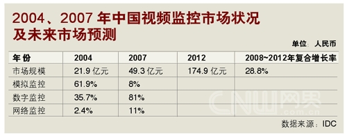 IDC的數(shù)字同樣樂觀。跟據(jù)IDC在2008年的預(yù)測(cè),2008~2012年,中國視頻監(jiān)控市場(chǎng)的年均復(fù)合增長(zhǎng)率將達(dá)28.8%,遠(yuǎn)高于IT市場(chǎng)投入的平均增長(zhǎng)率。而在模擬、數(shù)字與IP模式(即網(wǎng)絡(luò)監(jiān)控)組成的視頻監(jiān)控市場(chǎng)里,IP的增長(zhǎng)率又將高于前二者,成為市場(chǎng)增長(zhǎng)的強(qiáng)勁動(dòng)力。”(注:模擬監(jiān)控是指圖像信號(hào)在采集后,通過模擬信號(hào)傳輸?shù)姆忾]式視頻監(jiān)控系統(tǒng)模式;數(shù)字監(jiān)控是指圖像信號(hào)在采集后,經(jīng)過編碼轉(zhuǎn)化成數(shù)字信號(hào)再進(jìn)行傳輸?shù)姆忾]或半封閉式視頻監(jiān)控系統(tǒng)模式;網(wǎng)絡(luò)監(jiān)控是指系統(tǒng)建立在以網(wǎng)絡(luò)為基礎(chǔ)的傳輸平臺(tái)的開放式視頻監(jiān)控系統(tǒng)模式)。