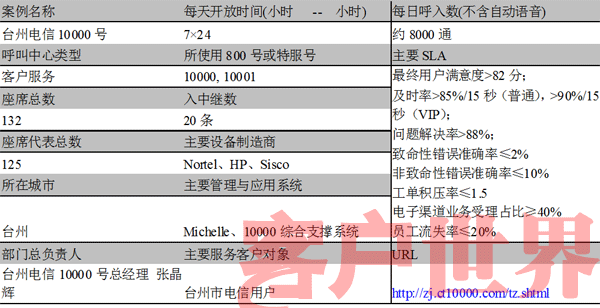 中國(guó)電信臺(tái)州市的10000客服中心,擁有100多名員工,承擔(dān)該市電信公司對(duì)外的所有客戶(hù)服務(wù)工作。中心先后被浙江省電信工會(huì)授予“先進(jìn)女職工集體”,浙江省電信分公司授予“學(xué)習(xí)型示范班組”、“創(chuàng)建學(xué)習(xí)型組織先進(jìn)班組(團(tuán)隊(duì))”,并獲得了“集團(tuán)公司優(yōu)秀10000號(hào)服務(wù)團(tuán)隊(duì)”,同時(shí)被中華全國(guó)總工會(huì)、信息產(chǎn)業(yè)部、共青團(tuán)中央授予“全國(guó)先進(jìn)女職工集體”以及“全國(guó)青年文明號(hào)”的稱(chēng)號(hào),連續(xù)兩年被信息產(chǎn)業(yè)部評(píng)定為“全國(guó)用戶(hù)滿(mǎn)意電信服務(wù)明星班組”。