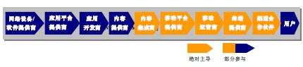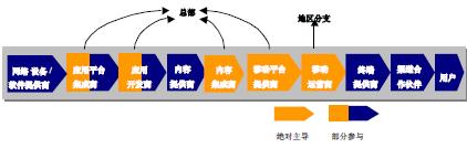 和記電訊是香港最大的流動(dòng)網(wǎng)絡(luò)運(yùn)營商。2004年1月,和記電訊率先在香港推出世界級的3G服務(wù)。其目標(biāo)就是成為最佳的3G移動(dòng)通信多媒體通信運(yùn)營商。和記電訊在產(chǎn)業(yè)鏈上承擔(dān)的角色如圖3所示。