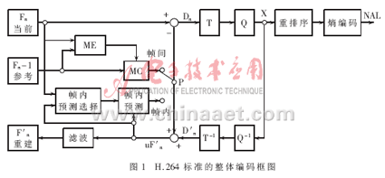Abstraction Layer),負責對數(shù)據(jù)進行打包和傳送。H.264編碼圖像通常分為三種類型:I幀、P幀、B幀。I幀為幀內(nèi)編碼幀,其編碼不依賴于已編碼的圖像數(shù)據(jù)。P幀為前向預(yù)測幀,B幀為雙向預(yù)測幀,編碼時都需要根據(jù)參考幀進行運動估計。同時,H.264在提高圖像傳輸容錯性方面做了大量工作,重新定義了適于圖像的結(jié)構(gòu)劃分。在編碼時,圖像幀各部分被劃分到多個Slice結(jié)構(gòu)中,每個Slice都可以被獨立編碼,不受其他部分影響。Slice由圖像最基本的結(jié)構(gòu)——宏塊組成,每個宏塊包含一個16×16的亮度塊和兩個8×8的色度塊。H.264標準的整體編碼框圖如圖1所示。編碼過程中,原始數(shù)據(jù)進入編碼器后,當采用幀內(nèi)編碼時,首先選擇相應(yīng)的幀內(nèi)預(yù)測模式進行幀內(nèi)預(yù)測,隨后對實際值和預(yù)測值之間的差值進行變換、量化和嫡編碼,同時編碼后的碼流經(jīng)過反量化和反變換之后重構(gòu)預(yù)測殘差圖像,再與預(yù)測值相加得出重構(gòu)幀,得出的結(jié)果經(jīng)過去塊濾波器平滑后送入幀存儲器。采用幀間編碼時,輸入的圖像塊首先在參考幀中進行運動估計,得到運動矢量。運動估計后的殘差圖像經(jīng)整數(shù)變換、量化和嫡編碼后與運動矢量一起送入信道傳輸。同時另一路碼流以相同的方式重構(gòu)后,經(jīng)去塊濾波后送入幀存儲器作為下一幀編碼的參考圖像。