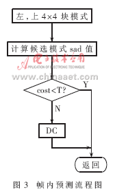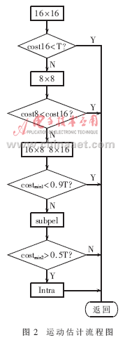 (4)算法替代和改進。幀間預(yù)測的改進:關(guān)于算法的改進主要集中在對me(motion estimation)的改進上,流程如圖2所示。costmin1=min(cost16,cost8,cost16×8,cost8×16),costmin2=min(costmin1,costsub),依次在16×16、8×8、16×8和8×16大小宏塊的整像素位置做預(yù)測,再做次像素估計和幀內(nèi)預(yù)測,選用匹配準則函數(shù)(采用sad作為匹配準則函數(shù))取得最小值的模式進行編碼。每計算一種模式,都將sad值與一個經(jīng)驗閥值做比較。當sad值小于這個閥值時,立即結(jié)束運動估計,從而減少運算量。
