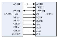 SDRAM的CLK信號(hào)由MPC860T的輸出時(shí)鐘CLKOUT驅(qū)動(dòng),/WE、/RAS和/CAS信號(hào)分別由UPMA的GPLA1~GPLA3產(chǎn)生。SDRAM的A10引腳要復(fù)用于SDRAM的刷新控制,因而必須與GPLAO相連(由于不方便連線圖中未畫(huà)出),因?yàn)镸PC860T的GPLAO可以通過(guò)編程實(shí)現(xiàn)控制信號(hào)與地址信號(hào)的復(fù)用。MT48LC4M16A2內(nèi)部有12條行地址和8條列地址,行地址為高位地址,列地址為低位地址,而外部?jī)H有12條地址信號(hào)A0~A11。這就需要對(duì)UPM對(duì)地址進(jìn)行復(fù)用。MPC860T支持內(nèi)部地址復(fù)用,可以通過(guò)UPM的RAM字中的AMX位進(jìn)行配置,同時(shí)將OR寄存器中的SAM位同時(shí)進(jìn)行配置。相關(guān)寄存器配置為:BR2=Ox0000081,說(shuō)明:32位寬,無(wú)奇偶校驗(yàn),無(wú)寫(xiě)保護(hù),選擇UPMA,基地址00000000;OR2=OxFF000A00,說(shuō)明:16Mbyte容量,地址復(fù)用。