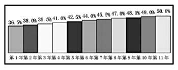 除了分檔包月的語音套餐,KDDI還根據(jù)消費(fèi)者的不同需求提供了多樣折扣優(yōu)惠,其中包括在網(wǎng)時(shí)長優(yōu)惠、家庭優(yōu)惠、個(gè)人優(yōu)惠、學(xué)生優(yōu)惠等多種方式(圖1)。多樣優(yōu)惠折扣方式之間也可以通過組合產(chǎn)生新的優(yōu)惠折扣內(nèi)容。例如:在網(wǎng)時(shí)長優(yōu)惠與家庭優(yōu)惠共享的套餐在入網(wǎng)的第1年優(yōu)惠折扣達(dá)到40%,此后每續(xù)約1年將增加1%的折扣優(yōu)惠,逐年累積下來,在第11年將享受高達(dá)50%的優(yōu)惠折扣(圖2)。時(shí)段優(yōu)惠套餐中體現(xiàn)分時(shí)段優(yōu)惠,區(qū)分忙時(shí)、閑時(shí),周末時(shí)間和工作時(shí)間,分別定價(jià)。例如,同樣是9500日元的套餐檔次,在時(shí)段優(yōu)惠套餐中,周末白天(閑時(shí))的資費(fèi)是每分鐘10日元,而在非時(shí)段優(yōu)惠的普通套餐中,每分鐘的資費(fèi)是24日元,可見在網(wǎng)絡(luò)閑時(shí)可以享受更多的資費(fèi)優(yōu)惠。而針對(duì)學(xué)生和老人設(shè)計(jì)的套餐也能享受比普通套餐更優(yōu)惠的資費(fèi),這就體現(xiàn)了區(qū)別細(xì)分市場(chǎng)的差異化定價(jià)。