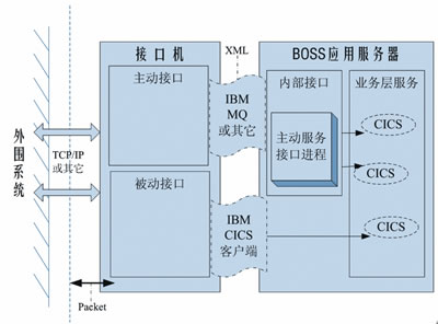 由圖1可知,從調用方向的角度看,接口可分為主動接口和被動接口,分別表示BOSS調用外圍系統(tǒng)服務,以及外圍系統(tǒng)調用BOSS服務。主動接口由BOSS應用服務器驅動,即BOSS應用服務器上的主動服務接口進程,是調用CICS對相關待處理表進行輪詢,并將每一條記錄封裝為一條消息放入MQ隊列(該隊列均由消息組成),接口機上的主動接口再從隊列中取出消息進行解析,進而根據控制信息發(fā)送到指定系統(tǒng)執(zhí)行。被動接口則是由外圍系統(tǒng)驅動,通過接口機上的CICS客戶端調用BOSS應用服務器上的業(yè)務層服務操作數(shù)據庫。