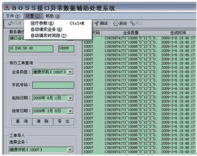 利用BOSS接口異常數(shù)據輔助處理系統(tǒng)執(zhí)行以上應急流程的方式是:在提取號碼后,根據客服協(xié)議開機命令字10007格式要求(HandsetNo~工號~返回格式~nCode~sType~備注),將批量號碼構造成報文列表并導入系統(tǒng)執(zhí)行。主界面如圖5所示。