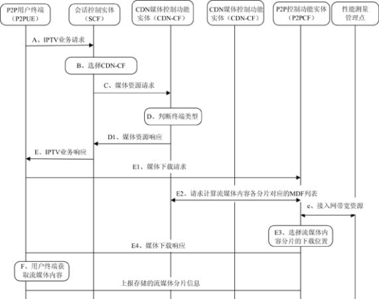 - P2PCF接收到用戶請求之后,首先向CDN-CF請求計(jì)算節(jié)目各分片對應(yīng)的CDN-MF列表。這樣P2PCF可以根據(jù)一定的策略將CDN-MF的地址融合在最終傳送給P2PUE的對等節(jié)點(diǎn)列表中,如為了提高面向用戶的響應(yīng)速度,可以控制P2PUE接入到CDN-MF獲取第一個(gè)分片或后續(xù)幾個(gè)分片。P2PCF還可以將CDN-MF作為某個(gè)分片的備選地址,當(dāng)P2PUE在嘗試列表中的其他對等節(jié)點(diǎn)失敗時(shí),仍然可以從CDN-MF獲得分片。