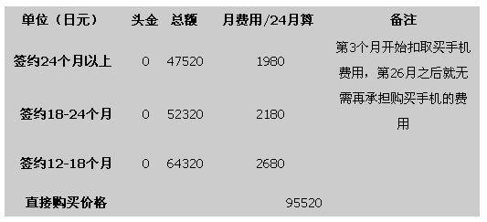 我們都知道日本的購買手機(jī)最主要是和運(yùn)營商簽約購買,我們以夏普2009年夏季最新款手機(jī)Soft Bank 933SH為例,來說明一下在日本購買手機(jī)的成本?偟膩碚f,就是簽約時(shí)間越長(zhǎng),購買手機(jī)價(jià)格越低,簽約時(shí)間越短,購買價(jià)格越高。