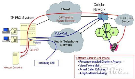 Sprint-Nextel最近推出了一種運(yùn)用Femtocells技術(shù)、類似cFMC的解決方案,稱為Airave。按照這個(gè)方案,用戶把蜂窩通信網(wǎng)絡(luò)的一個(gè)小型基站同基地的寬帶互聯(lián)網(wǎng)連接在一起。如圖1所示,這兩種方案都是利用寬帶互聯(lián)網(wǎng)和蜂窩通信網(wǎng)絡(luò)其中之一實(shí)現(xiàn)Voip,不同的區(qū)別只是本地的無線連接是運(yùn)用Wi-Fi技術(shù)還是蜂窩通信網(wǎng)絡(luò)。對企業(yè)用戶而言,主要缺點(diǎn)是,這兩種實(shí)現(xiàn)方式提供的都是由用戶主導(dǎo)的單一語音服務(wù),而沒有面向企業(yè)PBX或移動(dòng)UC系統(tǒng)的接口。