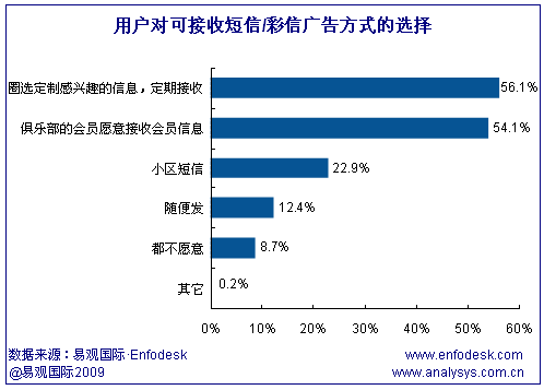 從用戶對短信廣告的接受程度來看,用戶對于自己感興趣領(lǐng)域的短信廣告并不反感,甚至樂于接受或定制。根據(jù)易觀國際Enfodesk發(fā)布的用戶調(diào)研數(shù)據(jù),56.1%的用戶愿意定制自己感興趣的信息,54.1%的用戶愿意接受會員信息,只有8.7%的用戶不愿意接受任何形式的短信/彩信廣告。但是這類用戶樂于接受的短信廣告反而一般有固定的端口號,更容易被攔截,因此易觀國際(Analysys International)認為,該短信過濾業(yè)務更加傾向于攔截對用戶相對更有價值的信息,造成垃圾信息“驅(qū)逐”有價值信息的結(jié)果,不利于短信廣告行業(yè)的健康發(fā)展。
