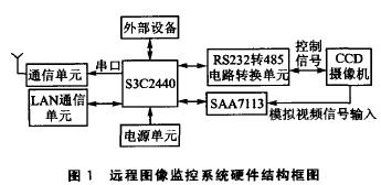 本系統(tǒng)采用三星公司的S3C2440嵌入式處理器和arm-linux2.4.26操作系統(tǒng);S3C2440使用ARM920T內(nèi)核,主頻是400MHz;除了集成通用的串口控制器、USB控制器、A/D轉(zhuǎn)換器和GPIO等功能之外,還集成了一個(gè)攝像頭接門(CAMIF)(這個(gè)接口是遠(yuǎn)程圖像采集的核心部分)。系統(tǒng)在S3C2440處理器的控制下,從CCD攝像機(jī)采集模擬視頻信號(hào),然后經(jīng)過(guò)編碼、DMA傳輸?shù)絻?nèi)存緩沖,接著由軟件對(duì)內(nèi)存中的數(shù)字視頻數(shù)據(jù)進(jìn)行壓縮和打包.最后通過(guò)通信單元將圖像以IP包的方式發(fā)送到監(jiān)控中心的服務(wù)器。整個(gè)系統(tǒng)的硬件結(jié)構(gòu)原理如圖1所示