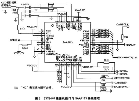 4:2:2格式。對(duì)SAA7113初始化需要通過(guò)I2C 總線進(jìn)行,而S3C2440內(nèi)部集成的I2C控制器正好可以實(shí)現(xiàn)這個(gè)過(guò)程。S3C2440的攝像機(jī)接口與SAA7113的連接原理如圖3所示。